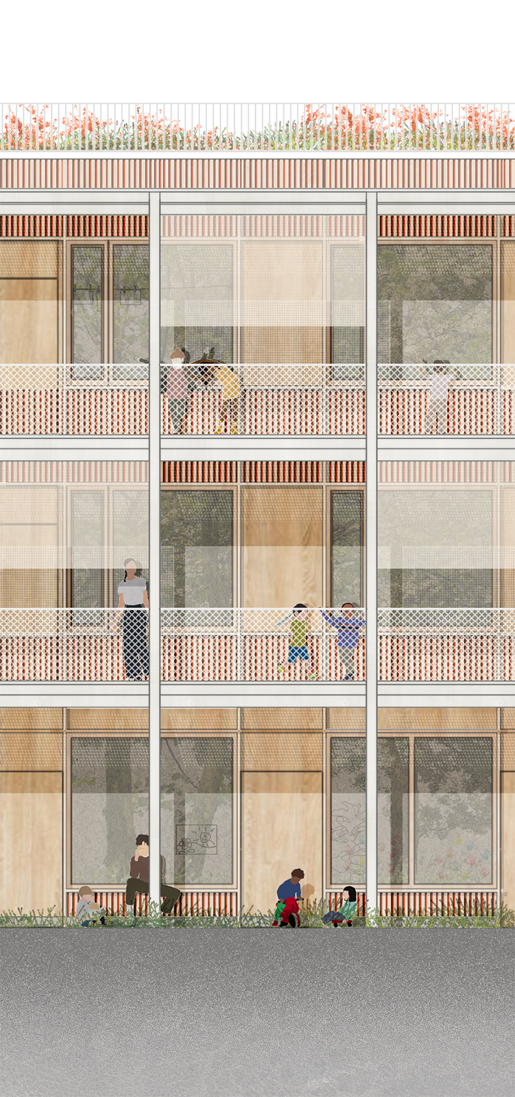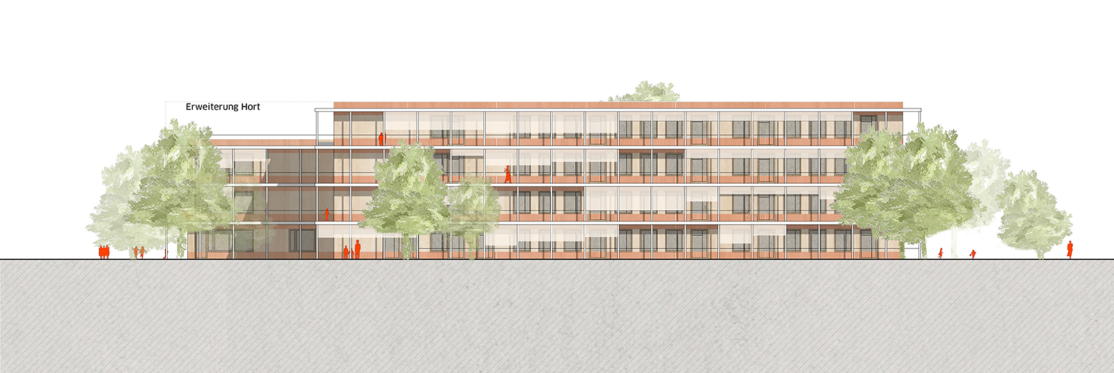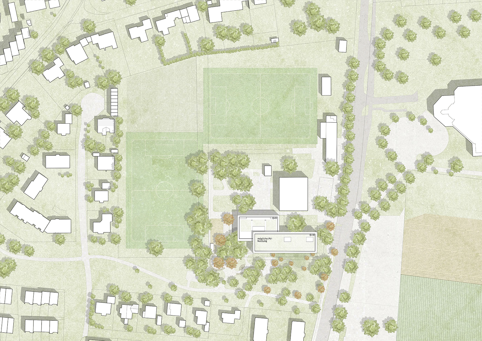 Die städtebauliche Einbindung der bestehenden Schule erfolgt durch einen versetzten Baukörper, der in Reihe angeordnet ist und zusammen mit der Sporthalle ein harmonisches Ensemble bildet. Diese Anordnung ermöglicht eine Schulerweiterung durch eine Aufstockung auf dem Bestand, wodurch die versiegelten Flächen unter klimaökologischen Gesichtspunkten optimiert werden. Das Schulhaus zeichnet sich durch eine klare Struktur aus, die eine zentrale Aula als multifunktionalen Begegnungsraum schafft. Die Aula wird über großzügige Freiflächen mit dem angrenzenden Gelände verbunden und den Schülern vielfältige Möglichkeiten für Aktivitäten im Freien geboten.