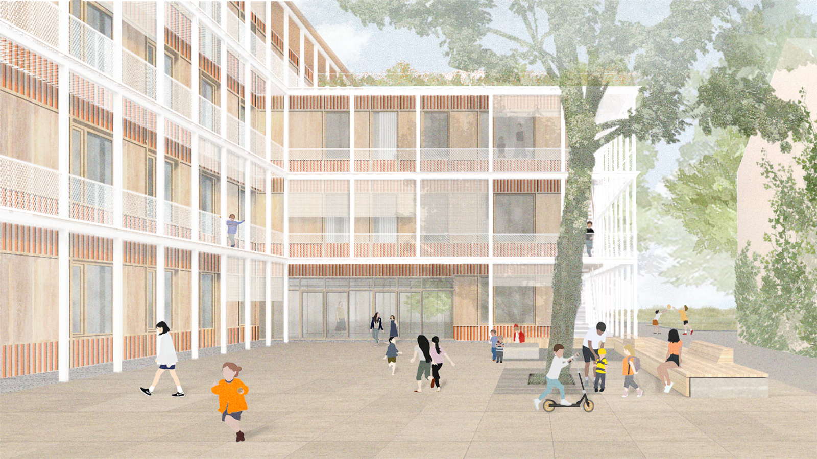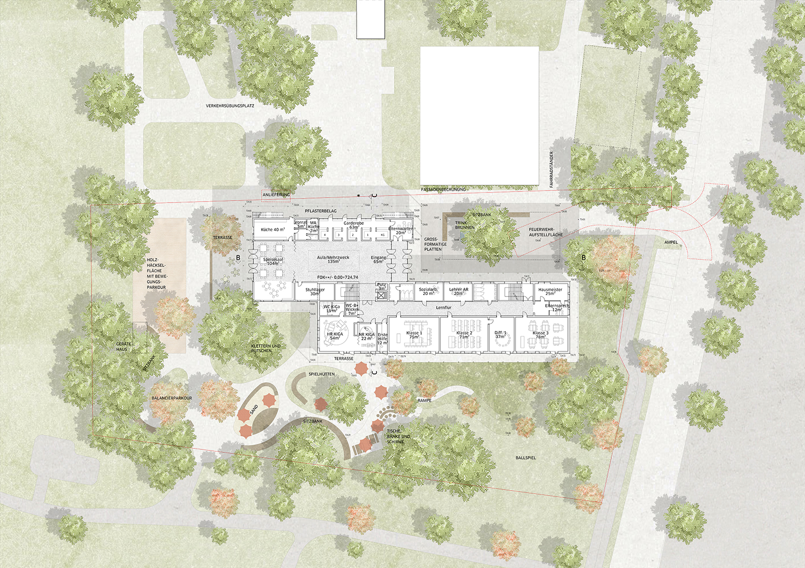 Die Freiflächen um das Gebäudeensemble sind vielfältig gestaltet und bieten sowohl Platz für Pausenaktivitäten als auch ruhige Rückzugsorte. Der zentrale Vorplatz vor dem neuen Haupteingang lädt zum Verweilen ein und wird von einem schönen Bestandsbaum beschattet. Zudem fördern grüne Inseln und Bewegungsbereiche das Spiel und die Kreativität der Kinder. Eine Zisterne im westlichen Bereich sorgt für Überflutungsschutz und ermöglicht die Wiederverwendung von gesammeltem Regenwasser.Insgesamt entsteht so ein lebendiges Schulumfeld, das sowohl den Bedürfnissen der Schüler als auch den Anforderungen an Nachhaltigkeit gerecht wird.
