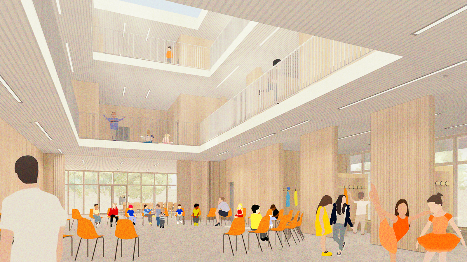 Die neuen und bestehenden Fassaden werden mit einer kerngedämmten Holzständerfassade ausgeführt bzw. ergänzt und tragen zur Energieeffizienz des Gebäudes bei. Im Inneren sorgen Parkettböden und Holzverkleidungen für eine behagliche Atmosphäre, die das Lernen und Lehren unterstützt. Ein energieeffizientes hybrides Lüftungssystem mit Wärmerückgewinnung gewährleistet ein gesundes Raumklima; es schaltet sich automatisch ein, wenn die CO2-Belastung steigt, während Fenster alternativ geöffnet werden können.
