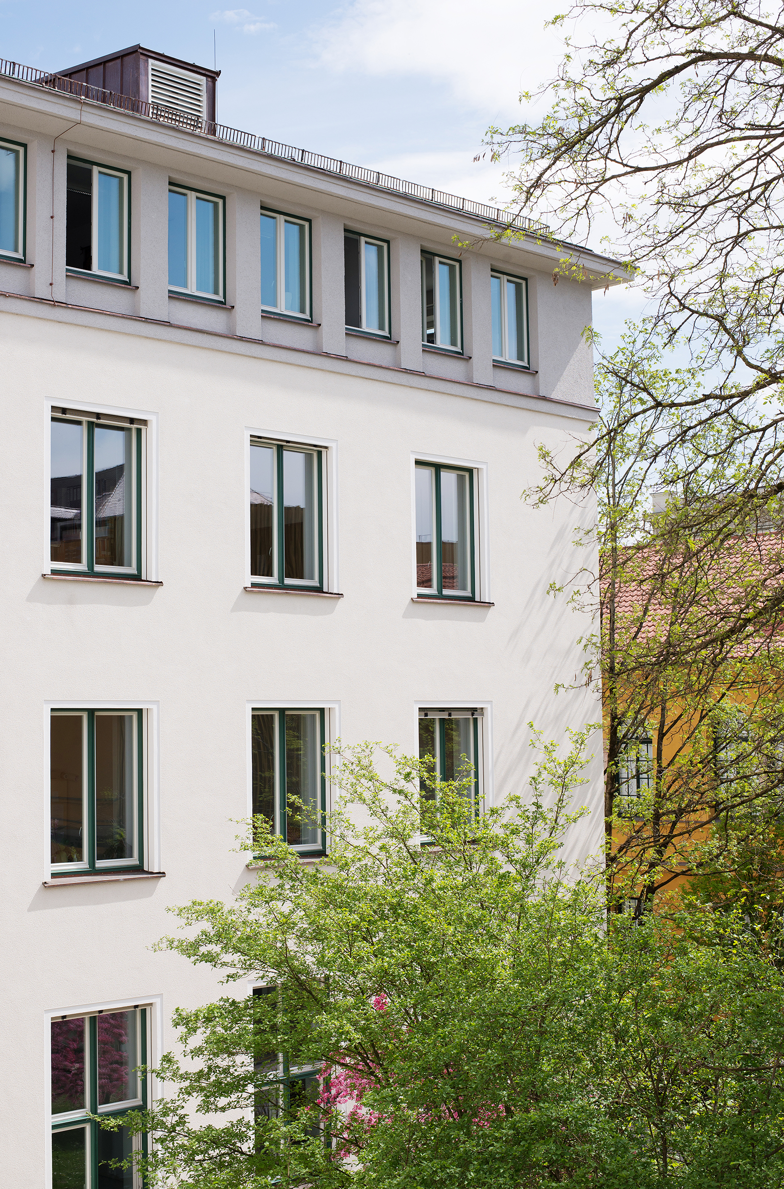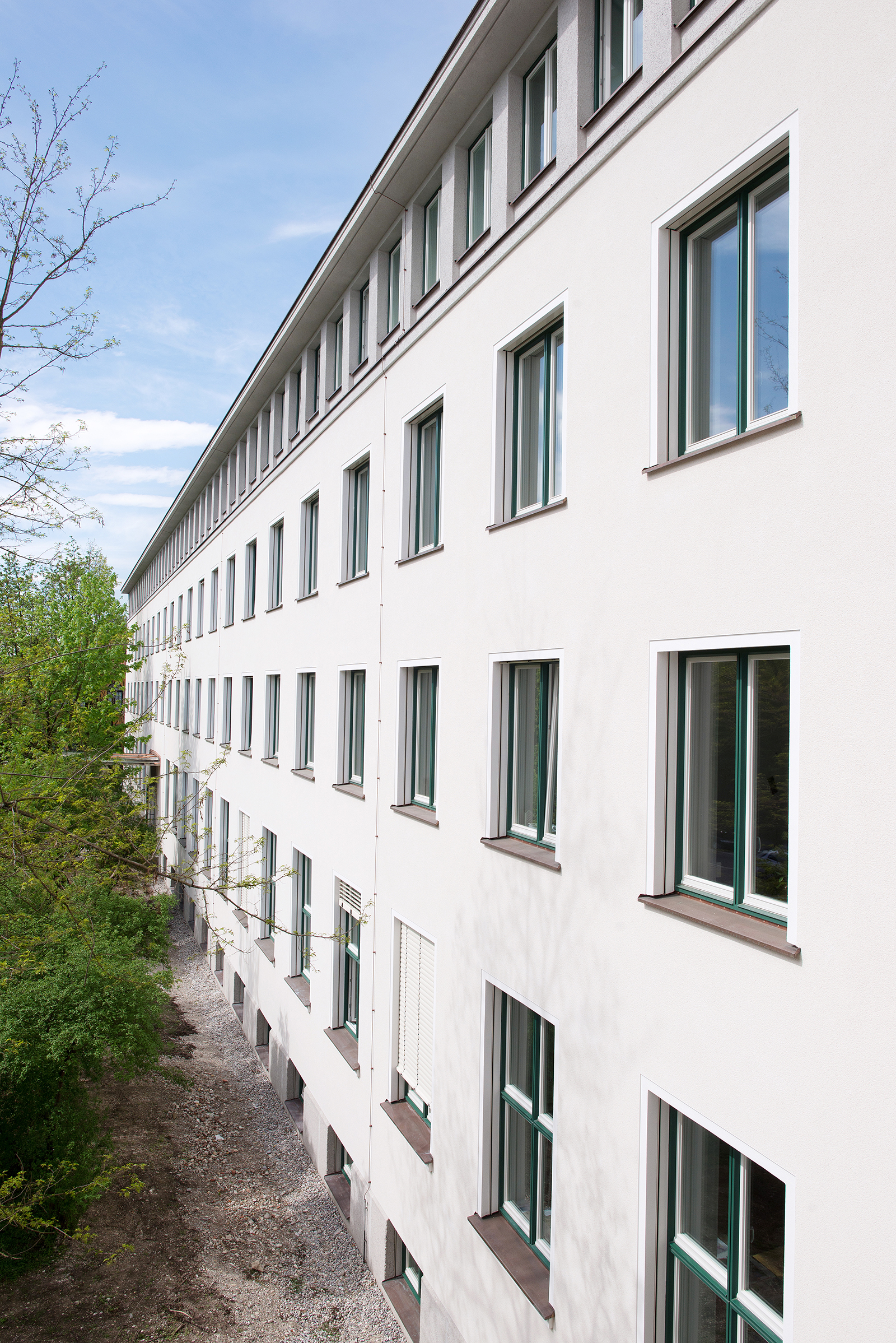 Das Gebäudeensemble der Ludwig-Maximilians-Universität (LMU) liegt an der Luisenstraße im Münchener Stadtteil Maxvorstadt. Der 50er-Jahre-Bau gliedert sich auf einem T-förmigen Grundriss in drei Gebäudeteile. Eine intensive Analyse des Bestandes machte typologische Anleihen an den denkmalgeschützten Altbau sowie an die repräsentative Fassade des nahen Lenbachhauses ablesbar, hier insbesondere die Gliederung in Sockel, Hauptgeschosse und Attika. Ein gegenüber den restlichen Gebäudeteilen klar abgegrenzter Sockel bildet ein verbindendes Element über alle Bauteile hinweg.