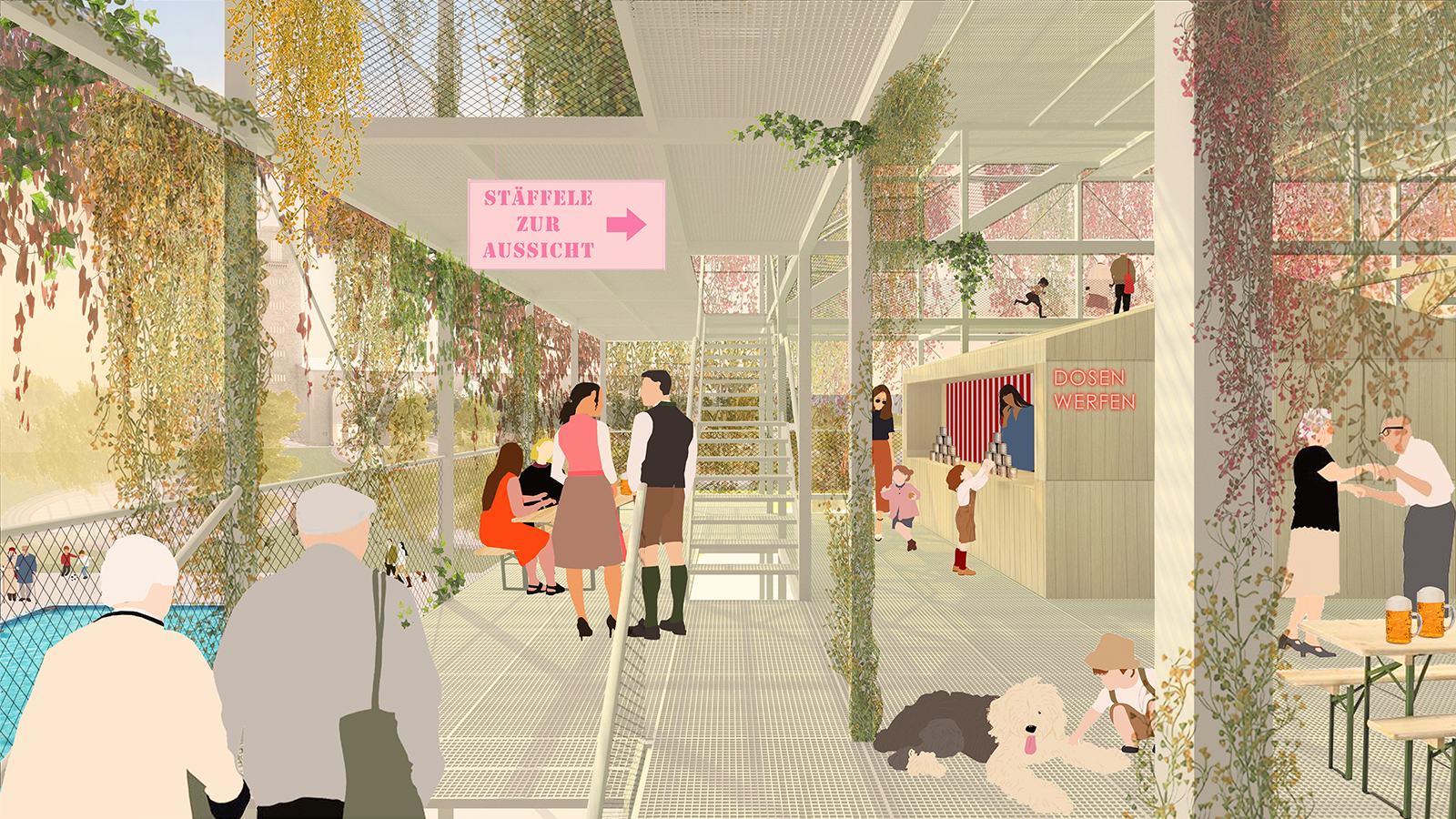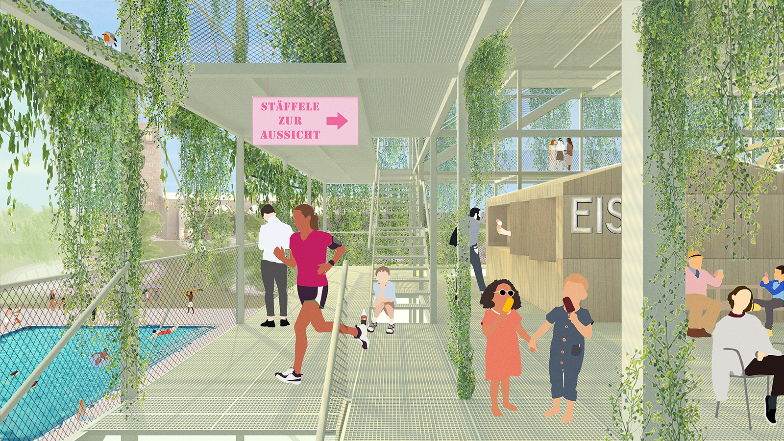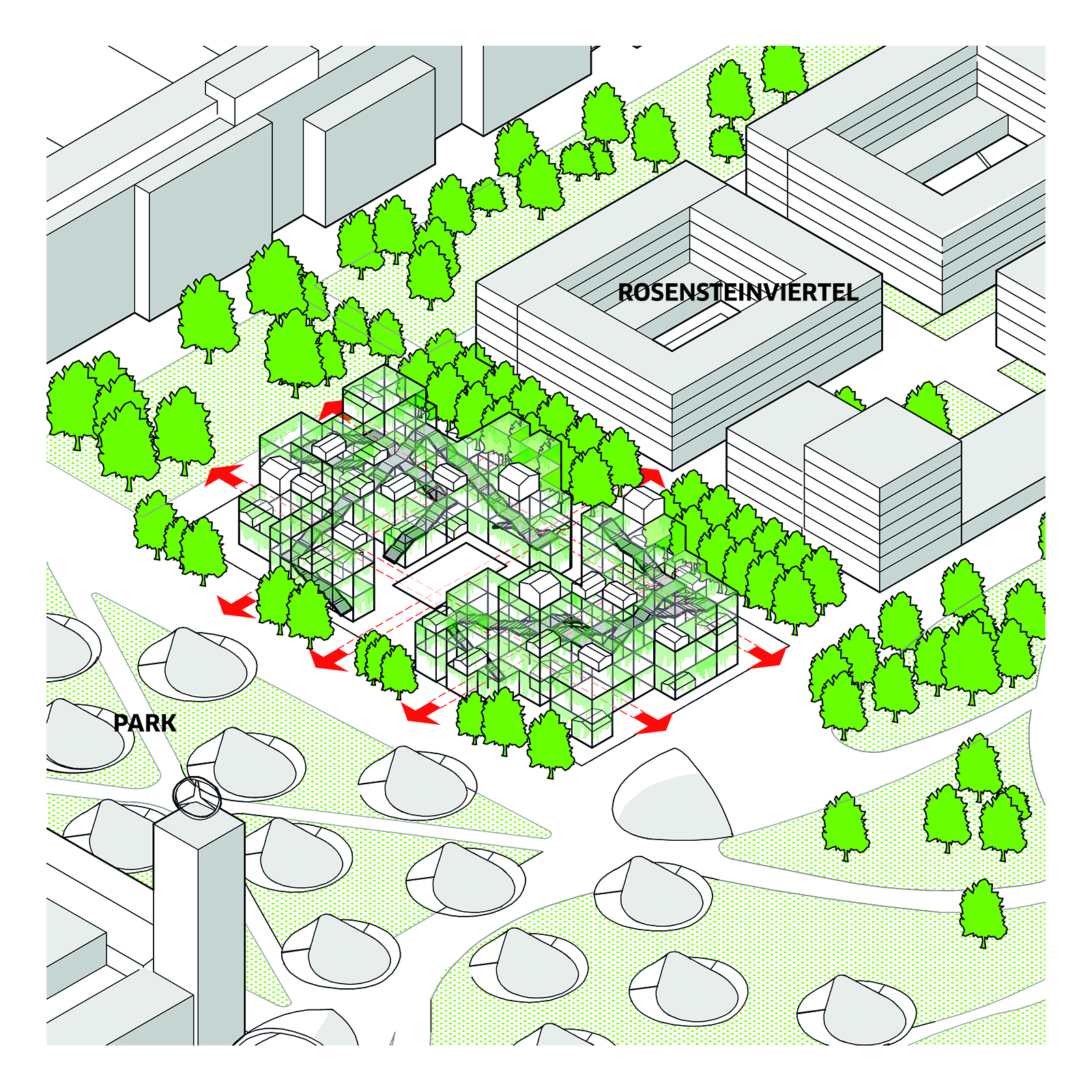 Die lichtdurchlässige Struktur soll weitestgehend begrünt werden. Die Begrünung schafft im Laufe der Jahreszeiten unterschiedliche Stimmungen und die Witterungen sowie Jahreszeiten sind stets wahrnehmbar. Die Struktur wird durch ruhige Sitzbereiche im Grünen ergänzt.