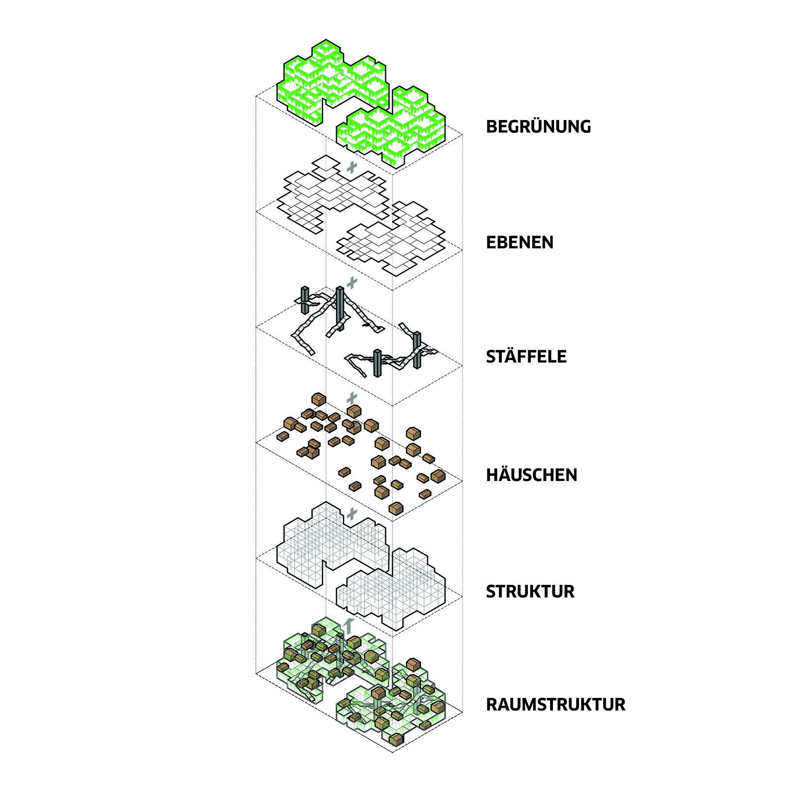 Die vertikale Erschließung erfolgt über unsere Interpretation der „Stäffele“, die verschiedene Geschosse verbinden, verschiedenartige Blickwinkel ermöglichen und als Sitzstufen dienen. Diese werden ergänzt durch Aufzüge für eine barrierefreie Erschließung.