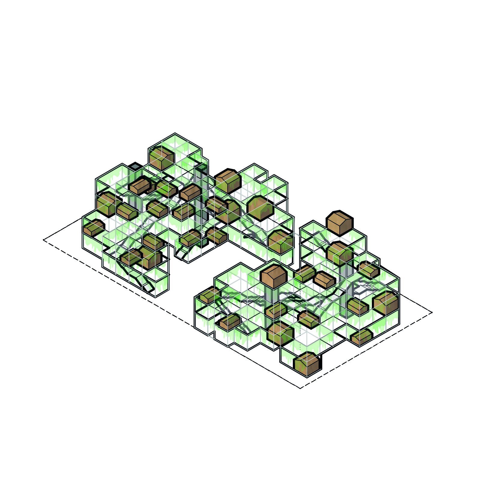 Gitterrostböden sind als Plattformen in die Struktur integriert, welche lichtdurchlässig und witterungsbeständig sind, um ein helles und leichtes Ambiente zu erschaffen. Innerhalb der Struktur befinden sich Buden und Häuser in verschiedenen Modulgrößen von 25 bis 75 qm, die flexibel für verschiedene Nutzungen angemietet werden können und sich je nach Jahreszeit und Bedarf wandeln lassen. Im Erdgeschoss können die Modulgrößen auf bis zu 200 qm ausgedehnt werden. Ermöglicht wird das durch eine Fassadengestaltung, die verschiedene Bereiche der Buden öffenbar macht – So kann die Fassade thermisch geschlossen werden, teils geöffnet oder komplett zur Seite geschoben werden.