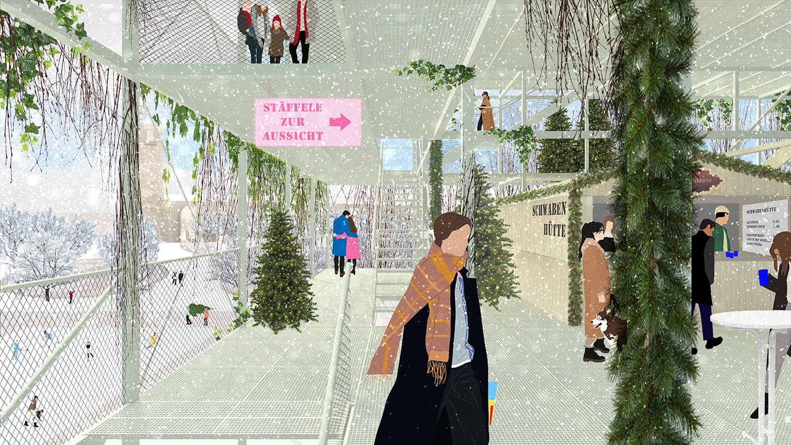 Von den Hochpunkten der Raumstruktur kann das lebhafte Treiben des Bahnhofsareals beobachtet werden. Durch die offene Gestaltung ermöglicht die Raumstruktur eine Verbindung des Rosensteinviertels mit dem Bahnhof. Die Struktur ist licht- sowie luftdurchlässig gestaltet, sodass man sich stets im Außenraum befindet.