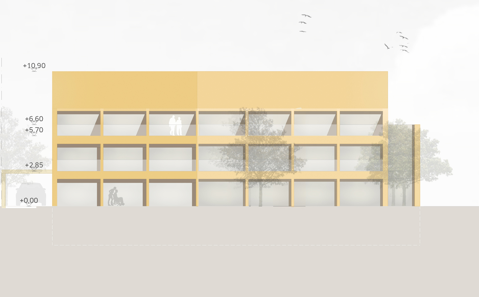 Die Baugrenzen, Geschossigkeit und die Dachform des Satteldaches wurden in das Entwurfskonzept integriert. Somit wird der vorhandenen Bebauung der südlichen Siedlungshäuser Rechnung getragen. Die im Bebauungsplan vorgesehene Abwinkelung der Straßenfassade wird als gestalterisches Element im Entwurf wieder aufgenommen und verkürzt optisch den Eindruck der Gebäudelänge.